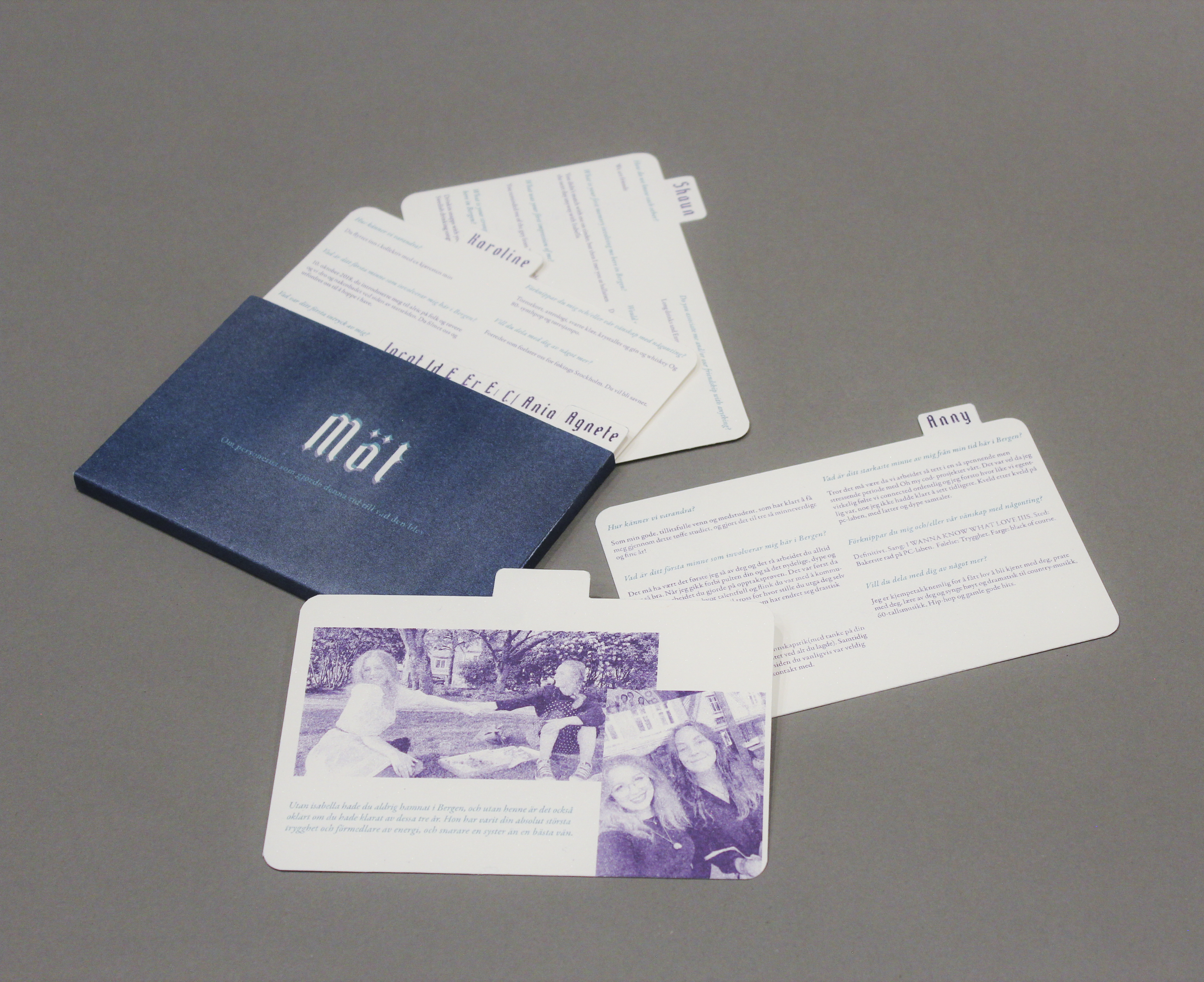 In the element Möt (meet) I have collected testimonies from the people I have met in Bergen describing their relationship with me. The cards in the index have one side showing my memories with these people, and another side showing theirs, complete with photographs.
